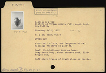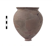 | Description: | About half of rim and fragments of wall missing. Restored in plaster. Small flat-bottomed knob as base; deep ovoid body; short concave neck; flat-topped rim. Buff clay. Traces of black glaze on inside. | |