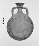 | Description: | No part of bottom preserved; pieces from sides and lip also missing. Restored in plaster. Both sides, shallow convex; short narrow neck with high flaring lip; two grooved handles. Ridge at base of lip on line of upper handle attachment. Traces of concentric circles in red on sides. Gritty clay, orange-red on inside, with light buff surfaces. | |