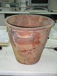 | Description: | A few pieces, including part of rim, missing; restored in plaster. Flat bottom; straight slightly flaring sides; flat-topped rim with downturned edge; heavy horizontal loop handles on upper wall. Grooves at line of handles and above. Reddish to pinkish-buff clay. Red wash on inside, on rim and on handles; splashes on outside. Mended in antiquity with lead clamps. | |
