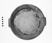 Description:   Most of floor missing; restored in plaster. Broad flat floor; straight flaring sides; plain rim; two lug handles at rim.