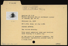 | Description: | The bottom missing. Very squat spherical body and vertical neck flaring to a plain lip. At the point of greatest circumference, two horizontal lug handles, each pierced by a round hole. Handmade of coarse reddish-brown clay with plentiful grits and mica. The surface brown and very slightly smoothed. | |
