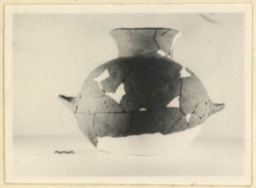 | Description: | The bottom missing. Very squat spherical body and vertical neck flaring to a plain lip. At the point of greatest circumference, two horizontal lug handles, each pierced by a round hole. Handmade of coarse reddish-brown clay with plentiful grits and mica. The surface brown and very slightly smoothed. | |