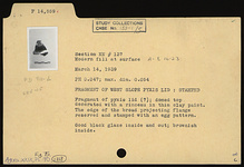 | Description: | Fragment of pyxis lid(?); domed top decorated with a rinceau in thin clay paint. The edge of the broad projecting flange reserved and stamped with an egg pattern. Good black glaze inside and out; brownish inside. | |