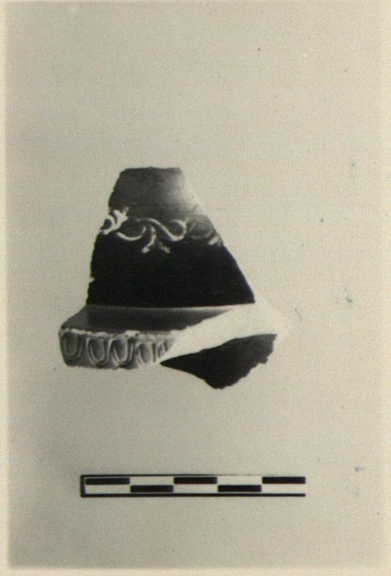| Description: | Fragment of pyxis lid(?); domed top decorated with a rinceau in thin clay paint. The edge of the broad projecting flange reserved and stamped with an egg pattern. Good black glaze inside and out; brownish inside. | |