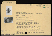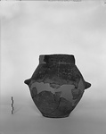 | Description: | Mended from many fragments; about half of rim, parts of wall, and half of one handle missing. Elongated biconical body on flat bottom; vertical rim. Horizontal lug handles, pierced; two large piercings through the rim immediately above the handles, on either side. Gritty clay, gray to red; dull burnish, brown in part. | |