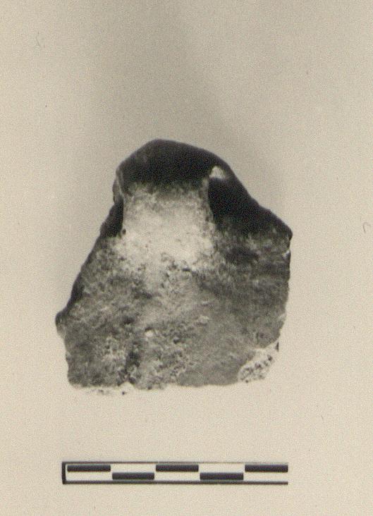| Description: | Fragment from the wall of a large open vessel with a lug handle, horizontally pierced. From the lower edge of the lug, a raised rib extends downwards not quite vertically. Gritty brownish clay, gray at core; red burnish inside and out. | |