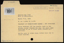 | Description: | Heavy vertical(?) lug handle, made in two pieces joined towards the top, the upper edge scalloped, leaving three rounded projections. Gritty gray to brown clay; rather dull red to black burnish. | |