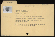 | Description: | Fragment of deep bowl; wall convex; lip slightly out-turned. Gritty gray to brown clay; black to brownish burnish inside and out, worn. | |
