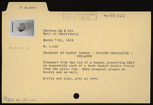 | Description: | Fragment from the rim of a vessel preserving what is apparently part of a band basket handle rising from the plain rim. Deep diagonal gouges on handle and on wall. Gritty red clay, gray at core. | |