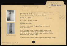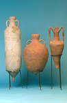 | Description: | Mended from many fragments; pieces of wall missing. Tall irregularly cylindrical body with pointed toe; sloping shoulder, tapering neck with thick rolled lip; handles from shoulder to below lip. Pinkish clay with thick yellowish gray slip. | |