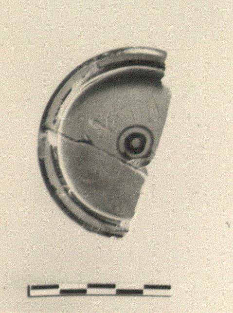 | Description: | Fragment of base of black glazed skyphos of Attic type. Incised on underside: <graphic> | |