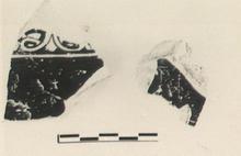 | Description: | Two fragments from upper wall of a large vase, glazed at least to below the neck inside; pelike? a) A bit of the lower part of the lotus and palmette band around the neck; below, the top of a woman's head, left. Ornaments in a faded color (white?) in her hair. Immediately to the right of the head, the single letter, Ε. Above: Ε Ι Δ b) Part of an uncertain pointed object; to left above: Ε Relief contour and brown inner drawing on object; partial relief contour for ornament. Excellent glaze, chipped. ADDENDA A third fragment (c) added, giving more of the neck palmette border. | |