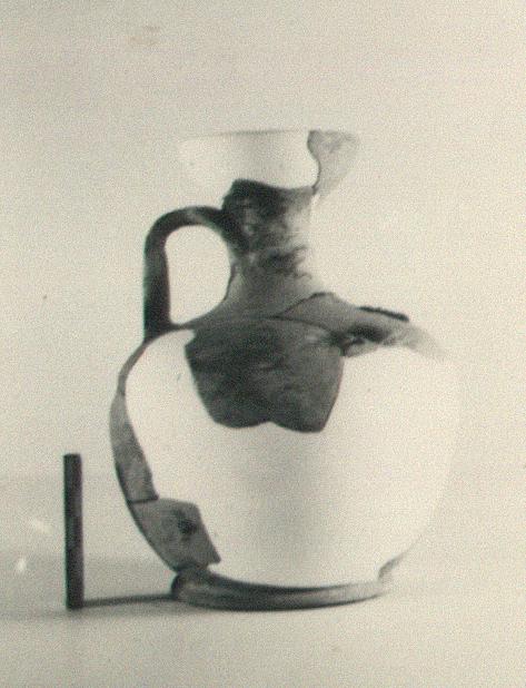 | Description: | Part of lip and much of walls missing; profile complete; restored in plaster. Small broad-shouldered globular jug on ring foot; narrow neck with handle-ridge; wide round bell mouth. Band handle, neck to shoulder. Red glaze, mostly peeled. | |