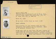 | Description: | Much missing; no join between neck and body fragments, but profile can be restored. Made up in plaster, without foot. Plump eggy body on ring foot, the wall forming an angle with the shoulder; continuous concave curve from below lip to shoulder angle. Broadly projecting lip, flat on top. Thick band handles, from below lip to near edge of shoulder. Single wheel run groove around shoulder above handle attachments. Sandy buff clay, gray at core. | |