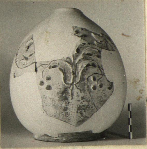 | Description: | Four fragments preserve parts of the wall and shoulder and the base of a round-bodied, narrow-necked jug with ring foot. No join between wall and base fragments. On b) the lower handle attachment. Decoration in applied relief of leaf sprays with berries and tendrils; a small bird perched on one tendril; an ivy leaf under the handle attachment; a ring of small dots around the base of the neck. ADDENDA Joining fragment added from tin 115 in 1952, serves to unite frags. b) and c). Description added by JWH in Sept. 2007: Large parts of both sides of body (part-mended, now restored); whole of base (connection with body fragments now lost). Handle missing except for lower attachment. Low-bellied plump ovoid body; at top, groove/offset around stump of a narrow neck. Low footring. Fine incisions around body at handle-base at belly and immediately above footring (guidelines for applied elements?). Clean-textured brown ware (medium thickness, neatly polished). Creamy white slip, yellowish tint in places, from storage (?) covering exterior with drips on interior. Slip ends at base, only splashes on bottom. Neat barbotine decoration (part-moulded, with added dots) covering most of exterior (to bellow belly). Decoration (under the slip): row of dots around neck-base; large downturned ivy-leaf (mould-applied?) on handle-base. Large upright palmette-like leaf-spray (11-leaf(?), with small 'ribbons' tieing base) on belly opposite handle, from which issue slender undulating stems curling around belly, with leaf-sheathes and with curling leaf-sprays and triple berries (part-moulded elements) emerging above and below on slender stems. Rows of tiny barbotine dots applied to some of the leaves. A small bird motif (part-moulded, part-barbotine?), perhaps one of a matching pair, perched on one of the lateral stems. Unique. Cf. RG barbotine ware series. Augustan period or a little later (ca. 20 B.C.-20/30 A.D.?). Find context probably pre-AD 40/50. | |