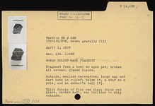| Description: | Fragment from a bowl or open pot; broken all around; glazed inside. Outside, moulded decoration: large egg and dart band in relief; below it, a star on a pole, and an animal's tail(?). Thick fabric of fine red clay; thick red glaze, rather dull, and inclined to chip outside. | |