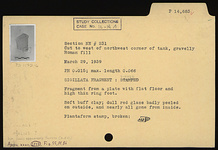 | Description: | Fragment from a plate with flat floor and a high thin ring foot. Plantaform stamp, broken: <graphic> Soft buff clay; dull red glaze badly peeled on outside, and nearly all gone from inside. | |