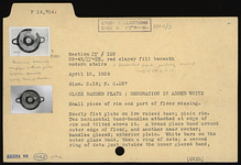 | Description: | Small piece of rim and part of floor missing. Nearly flat plate on low raised base; plain rim. Two horizontal band handles attached at edge of rim and tilted above it. A broad glaze band around outer edge of floor and another near center; handles glazed; exterior plain. White bars on the outer glaze band, then a ring of dots; a second ring of dots just outside the inner glazed band, and traces of some ornament on the band. At the center, a cross with filled angles. Buff clay, in part burned gray; dull black glaze, worn. | |