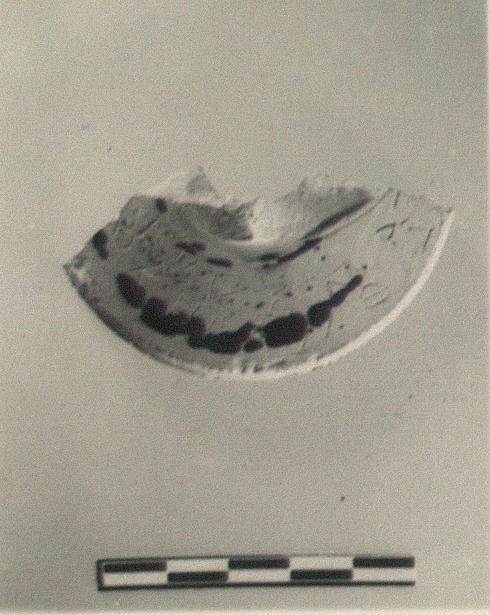 | Description: | About half remains. From a small black glazed kylix base. Incised on top: <graphic> and on underside: <graphic> Black glaze much flaked. | |