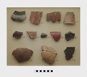 | Description: | Two joining fragments from the wall of a closed pot. Gritty reddish-brown clay, gray at core. Inside slipped; outside cross-hatched in alternate red and white stripes. | |