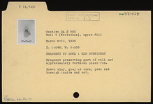 | Description: | Fragment preserving part of wall and approximately vertical plain rim. Brown clay, gray at core; poor red burnish inside and out. | |