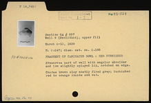 | Description: | Preserves part of wall with angular shoulder and low slightly splayed lip, notched on edge. Coarse brown clay mostly fired gray; burnished red to orange inside and out. | |