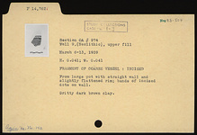 | Description: | From large pot with straight wall and slightly flattened rim; bands of incised dots on wall. Gritty dark brown clay. | |