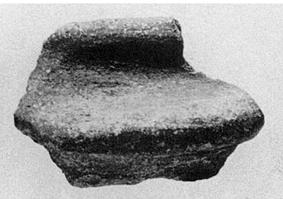 | Description: | From a large open vessel with a long narrow ledge or lug just below the slightly splayed rounded rim. Below lug, traces of plastic ornament. Dark brown gritty clay, gray at core. | |
