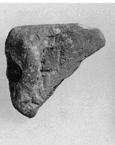 | Description: | From the wall of a large open vessel with plain lip; just below lip a clumsily made vertical lug. Gritty pinkish-brown clay, gray at core. | |