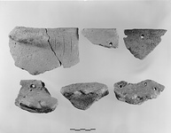 | Description: | From the vertical rim of a large jar. A string hole at base of rim. Gritty pinkish-brown clay, gray at core; roughly slipped inside and out. | |