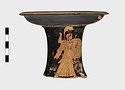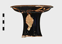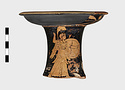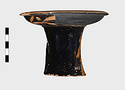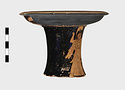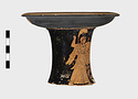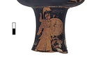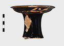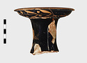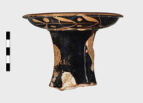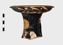 | Description: | The neck preserved in a single fragment, with more than half of the lip, mended from four pieces. Narrow neck, slightly concave; the mouth round, a very broad shallow echinus, with projecting rim slightly downturned and grooved along its inner edge. Handle attachment at back of neck. The top surface of the lip reserved except at inner edge. On the outside of the rim, an olive wreath, in red figure. On the front of the neck, Athena in panoply, right, wearing a chiton of which the long overfold has flying swallowtail ends: archaizing, Panathenaic type. Relief contours for flesh, and partially elsewhere. Careful work. Traces of pink wash on reserved surfaces. Cf. P 15840-P 15853. | |