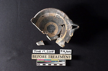 | Description: | Mended from many pieces; about half missing, with one handle. Low plain plate on low raised foot; horizontal strap handles; upper surface of rim slightly bevelled. Light brown micaceous clay; on top surface, two irregular bands in thin black glaze, and a solid black circle in center; handles glazed. | |