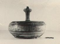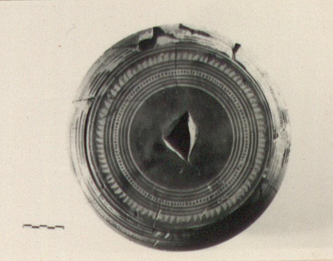 Around the outer part of the lid, a zone of tooth pattern, then a zone of dots with groups of bands between; center of lid glazed solid; on the handle, bands around lower part of stem, bands and a zone of chevrons on the knob, and bands on the tip.