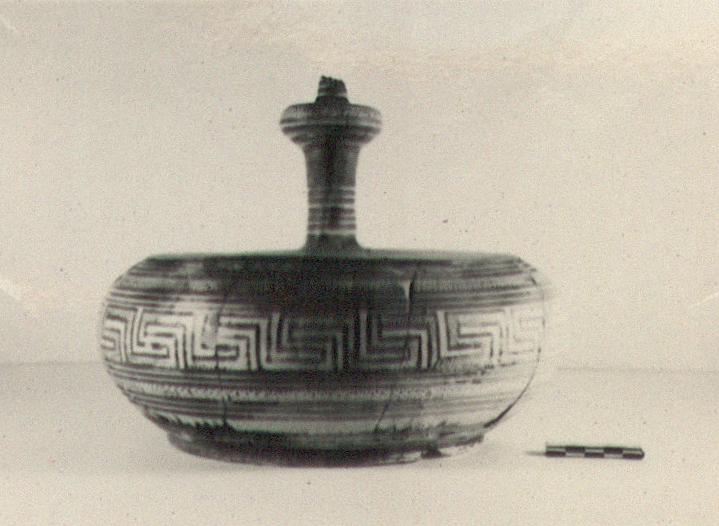 Description:   Mended from many pieces; the lid complete except for a chip from the knob, the tip of the handle, and small chips; the bowl complete save for a few small bits of wall and rim, and chips to the surface. Deep round-bodied pyxis on low ring foot; horizontal flange inset below top of wall to receive lid. Flat lid with tall central handle, composed of a high stem, a large roundish knob, and a small tip. Two string holes in rim and flange, on either side.
