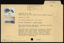 | Description: | Four non-joining fragments preserve profile and parts of rim and wall. Low base with concentric grooves on bottom; shallow body, and convex projecting rim, grooved near inner edge. Small pieces of millstone or lava set into floor. Round button-like knobs on rim; the beginning of the spout is preserved. Pinkish-buff clay with grits; lighter slip. Cf. P 11652. | |