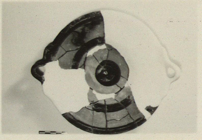 | Description: | About half the rim and wall, with one handle, missing; restored in plaster. The bottom flat, thickened; shallow body with plain rim and horizontal band handles attached at rim. Glazed circle at center of floor; glaze rings around, and glaze on handle. Buff clay; dull black glaze. | |