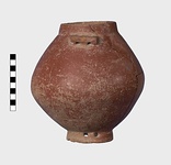 | Description: | Mended from several pieces; small part of lip and upper wall missing. Double conical shape, much as P 14871 (ΟΑ 1034), but less angular and rather less carefully made. On either side, just below the mouth, a rectangular ledge lug, pierced twice vertically; corresponding piercings in foot below. Coarse reddish clay, gray at core; red burnished slip, somewhat worn but preserving clear traces of striped decoration. | |