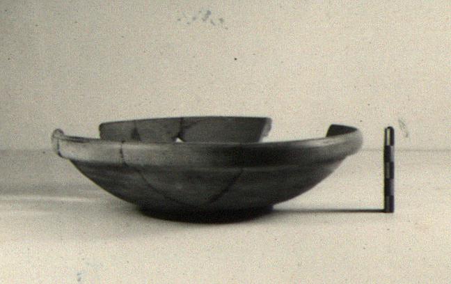 | Description: | Mended from many fragments; parts of rim, wall and floor missing. An open bowl with rounded sides; low ring foot; rim rounded on exterior so as to form a keel; floor slightly offset from wall; two grooves near its center. Light red clay. Light red glaze, thin but firm inside and over rim outside. Late Roman "B" Bowl. | |