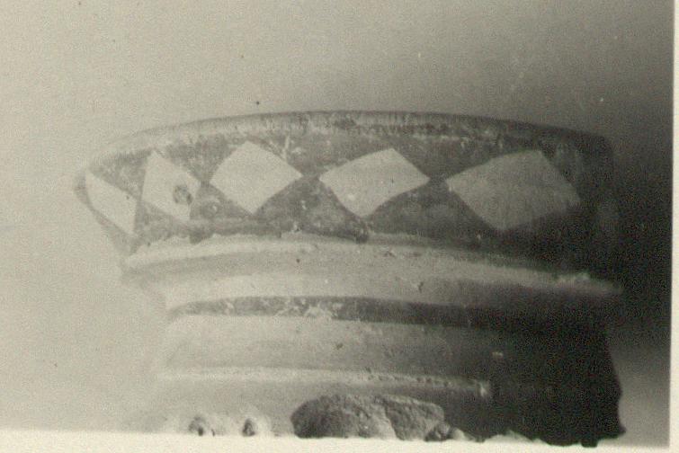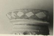 | Description: | Base fragment from large pot; less than half the circumference preserved. Broad conical shape, moulded on the outside, which is decorated in brownish-purple paint with a ring around the top of the base and an hourglass pattern around the bottom. Coarse clay, raspberry pink at the core, buff near the surface, covered with a finer buff slip. Paint dull and somewhat peeled. | |