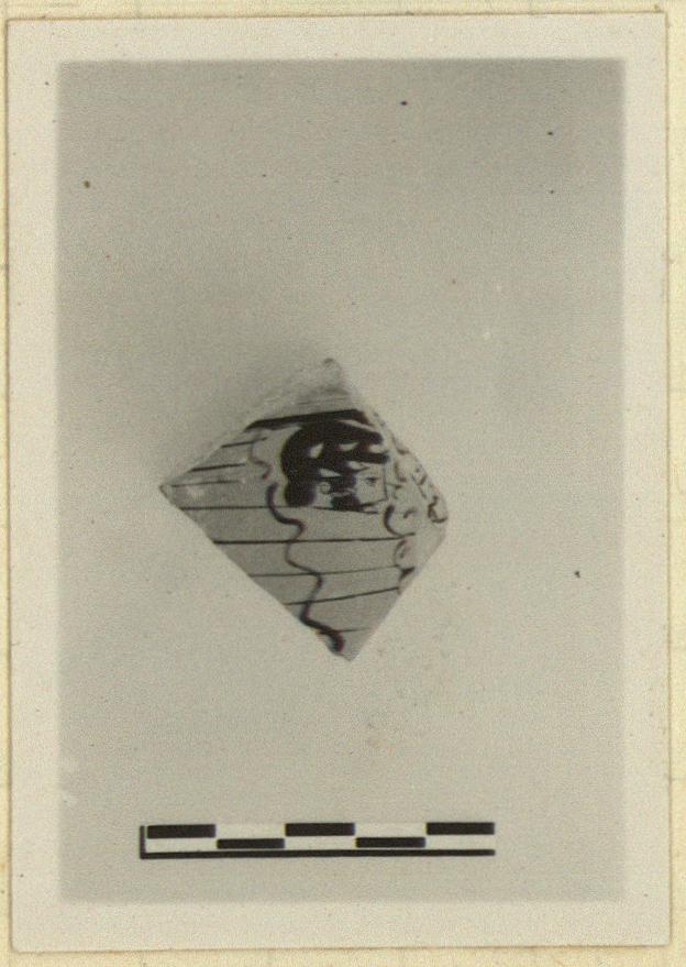 Description:   Fragment from wall of bell krater with trace of start of rim. Depicts a male head, bearded and wreathed, right, seen emerging from between a pair of wings (?).
