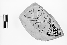 | Description: | Fragment from center of interior of kylix, including part of stem. Crouching nude male figure with a bit of drapery over his right arm. Good black glaze, badly chipped; thick lines for relief contours and interior drawing. | |