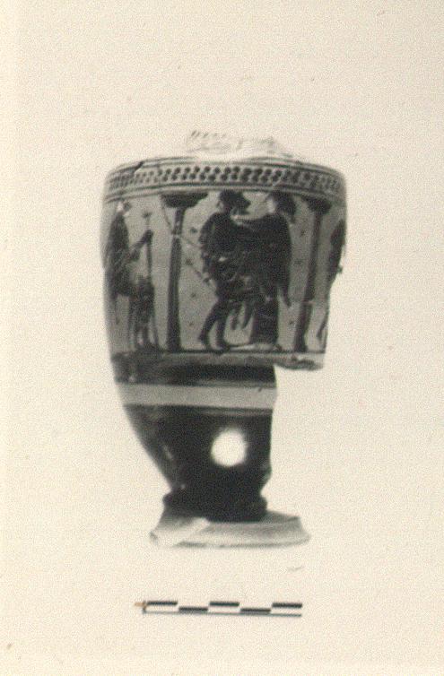 | Description: | Mended from many pieces; part of foot, much of back part of body, handle and neck missing. Broad-shouldered lekythos, shoulder sloping up gently towards neck. Body tapers sharply to bottom; moulded ring at junction with foot. Broad disk foot, nearly flat below; outer face flaring, slightly concave and finished below with small torus. Around base of neck, tongues; on shoulder, five palmettes with a lotus bud either side of the handle. Figured scene of five personages: at left, a gray-beard, cloaked and seated right, holding a cross-topped staff. Beyond a Doric column stand a man and woman embracing; the man wears a himation, the woman chiton, himation and sakkos. A second column separates this pair from another, who stand facing each other, each holding a flower; their dress is apparently similar; much of the lower part of the figures is missing. A third column closes the scene at the right. Double row of linked dots between pairs of glaze bands above scene; below, single ground line, then two red bands bordering a black; then a reserved band, and a line of red along the top of the black below. Red also around outer edge of top to foot; edge and underside of foot reserved. Added white for women's flesh, for hair and fillet of man at left, for fillet(?) of man in central group and for dots on garments. Added red for beard and front hair of man in right hand group, and for dots on garments. | |