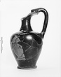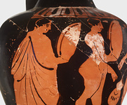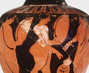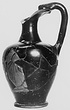 | Description: | Mended from several pieces. Most of the trefoil lip and much of the right side of the body missing. Egg-shaped body; flat bottom, projecting; narrow neck; handle round in section attached so as to form a large projection on the upper face of the lip. Tongues between bars on shoulder at front. Below, three youths; he at the left, cloaked, facing right and holding a large tympanum(?); he in center, nude, also right, and holding a similar object; he at the right, cloaked, facing left, and holding a large aryballos. Thick glaze, except under foot and below neck inside. The background glaze has slopped over the tongue pattern at the right above. | |