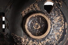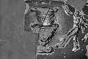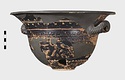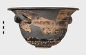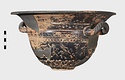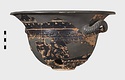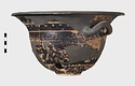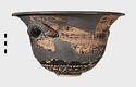 | Description: | Fragmentary; more than half of the walls preserved, but none of the lip. A large bowl with typical Megarian decoration, to which a base (small ring, perhaps not complete, preserved) and a flaring wheelmade rim have been added. At the junction of the two, on the line of the twisted horizontal handles, a scraped groove colored with miltos. Bowl: bottom, central rosette, from which rises an imbricated leaf pattern; central band, young satyrs with winged horses, in the field large goat masks; upper border, bands of egg and dart, dots, and small palmettes above spirals. Rim: painted inside and out in white and clay-colored paint ("west slope style"). Ivy pattern on both sides of a white band, outside; inside, pendent drops and garlands, in clay color with remains of white. On the bottom, inside, a scraped circle (Diam. ca. 0.11m.) enclosing four lines of clay color intersecting at the center. Good metallic black glaze inside and out, somewhat worn on the outside. | |
