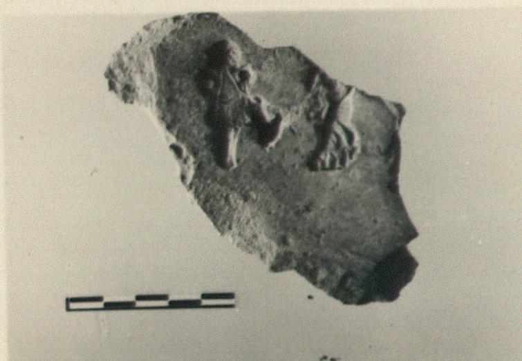 | Description: | Broken all around and at back. Mold for slightly convex object; bowl? Trace of edge of wall at bottom. Two figures preserved and traces of others at sides of fragment: man in short pleated tunic, playing pipes and dancing; woman in chiton and himation (head and shoulders missing) also dancing. Coarse brick-red clay. | |