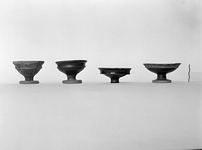 | Description: | Complete except for chips. Shallow bowl; flaring rim, sloping inwards within; without, concave in profile and sharply offset from wall. Fairly thick stem; cup foot flat on top and with vertical face; conical beneath. The inside of the bowl, the edge of the rim, the outside from lower edge of rim to outer edge of foot, and the underside of the foot, except for resting surface and top of cone, glazed red to black and somewhat worn. Inner and outer surfaces of lip reserved and washed with red. A scraped groove below the offset, and two lightly scraped grooves below on wall. | |
