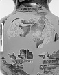 Additional fragments give parts of both figures: several pieces joining with each other but not with the vase wall; restored in plaster. Two figures moving right: first, a youth well wrapped in his himation; behind him a bearded figure, walking with the aid of a staff held in his right hand; his himation thrown over his left shoulder, the right shoulder bare. No relief contour; a little dilute glaze for the muscles.