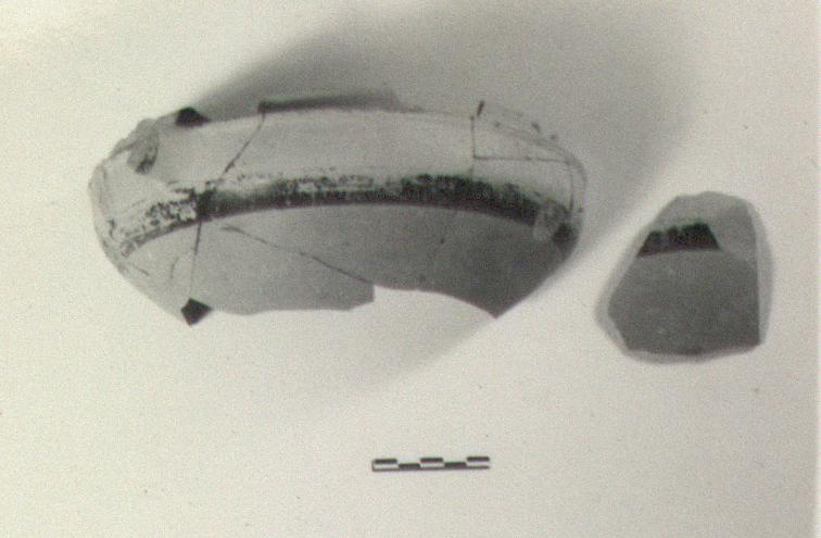 | Description: | Mended from many fragments; about half the wall and rim remain and the attachments of one handle; nothing of the base. One wall fragment does not join. Rather shallow bowl, the wall steep below, nearly straight above; vertical flange inset from rim to take lid. Horizontal band handle. Black glaze, much pitted, inside; outside unglazed except for the handles, for a band at edge of rim, and a broad band below handle attachments. Micaceous pink clay with some bits. | |