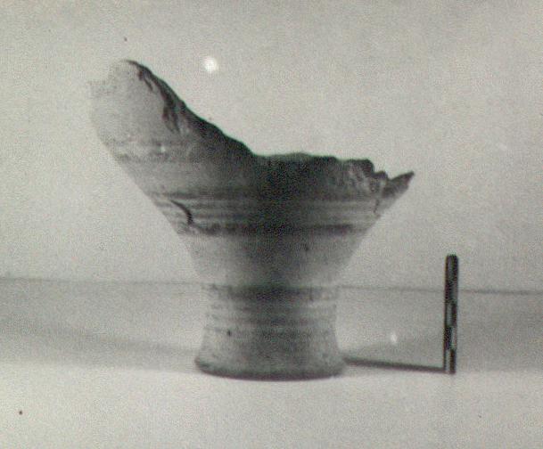Description:   A single fragment preserves the small foot and some of the lower part of the spreading body. Decorated with groups of horizontal red lines.