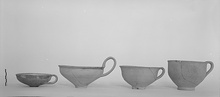 | Description: | Three joining pieces preserve the cup complete. Deep cup on low ring foot, plain slightly flaring lip, narrow ribbon handle from lip. Fine pinkish-buff clay, buff at surface; traces of buff slip. Inside water-proofed in matte red glaze; bands of same on handle. | |